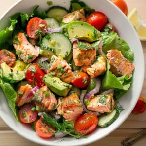 Deze paleo zalm en avocadosalade is een frisse, voedzame en rijke maaltijd boordevol gezonde vetten en eiwitten. Romige avocado wordt gecombineerd met zachte zalm en knapperige groenten voor een heerlijke, lichte lunch of diner die binnen enkele minuten klaar is.
