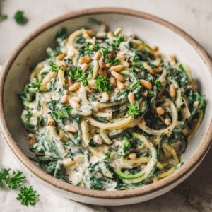 Deze romige keto spinazie cashewpasta is een snelle, gezonde maaltijd boordevol smaak. Zachte courgette zoodles worden overgoten met een rijke cashewroomsaus, op smaak gebracht met citroen en knoflook, en afgemaakt met verse peterselie en knapperige noten. Perfect voor een voedzame lunch of licht diner dat je energie geeft zonder koolhydraten.