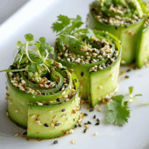Fris, romig en vol knapperige textuur, deze Keto Sesam-Avocado Rolletjes zijn een kleurrijke traktatie die snel te maken is. De zachte avocado smelt op je tong, terwijl de komkommerribbons zorgen voor een lichte crunch en verfrissing. Bestrooid met geroosterde sesamzaadjes, koriander en microgroenten voelt elke hap luxueus en gezond, perfect als snack, lunch of bijgerecht. Een low-carb hapje dat zowel je smaakpapillen als je lichaam verwent.