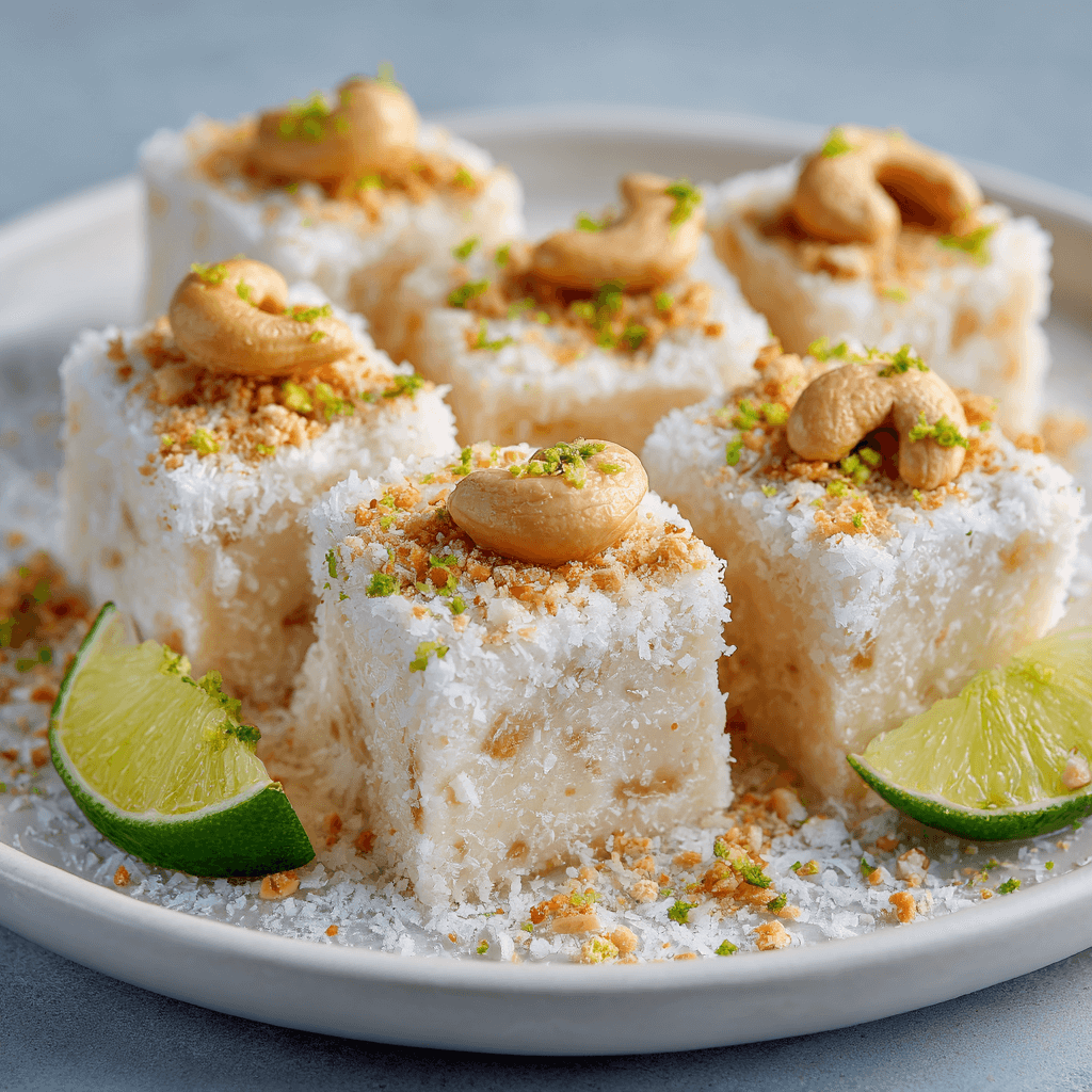 Leg de blokjes op een klein bord en bestrooi ze met extra geraspte kokos en cashewstukjes. Voeg een partje limoen toe voor kleur en frisheid. Zo worden ze niet alleen lekker, maar ook prachtig gepresenteerd.