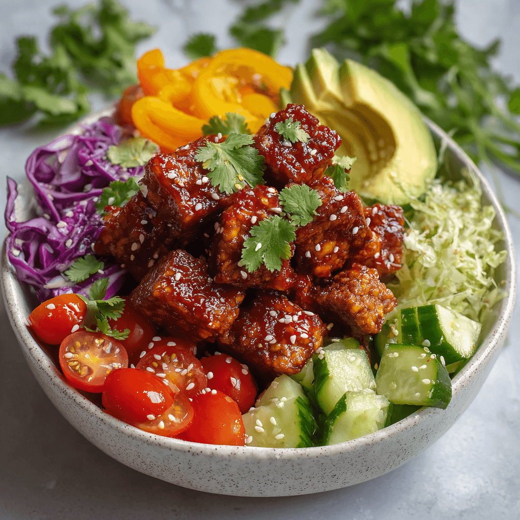 Duik in deze kleurrijke Keto Pittige Tempeh Groentebowl en laat je verrassen door een explosie van smaken! De knapperige, pittige tempeh combineert perfect met de frisse avocado, sappige cherrytomaten, krokante paprika en kool, terwijl het sesamzaad en de verse kruiden een extra smaakboost geven. Deze bowl is niet alleen heerlijk, maar ook voedzaam en volledig koolhydraatarm, vol eiwitten en gezonde vetten. Perfect voor een snelle lunch of diner, het is een gerecht dat je energie geeft en je een verzadigd, gelukkig gevoel achterlaat. Maak het, proef het en laat je zintuigen genieten van deze gezonde, plantaardige smaaksensatie.