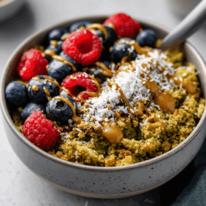 Een knapperige, energieke keto start van je dag met kokos en matcha. Deze Vegan Keto Coconut Matcha Breakfast Crumble is snel, voedzaam en heerlijk met bessen en amandelboter licht, vullend en vol smaak.