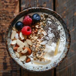 Paleo Kokosyoghurt met Noten en Zaden is een voedzaam en plantaardig ontbijt of tussendoortje. De romige kokosyoghurt gecombineerd met knapperige noten en zaden zorgt voor een heerlijke mix van texturen en smaken, ideaal voor een gezonde start van de dag of een energierijke snack.