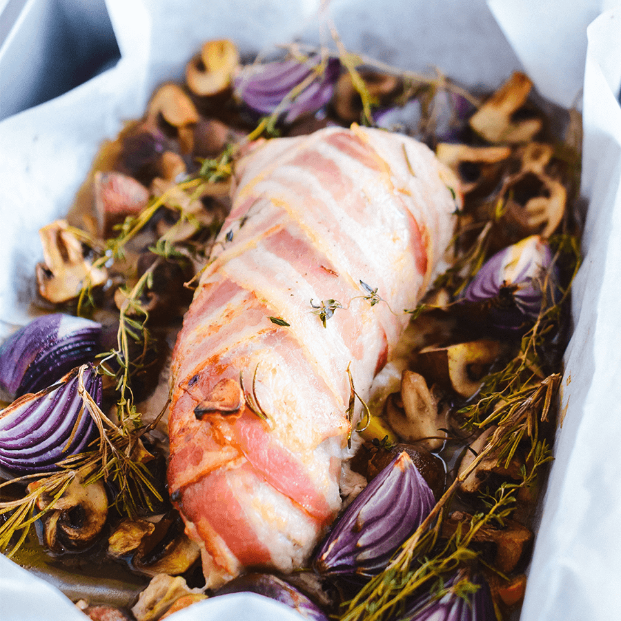 - Plaats de gebakken varkenshaas in het midden van de spek plakken en vouw het spek eromheen. Leg het geheel in de ingevette ovenschaal.